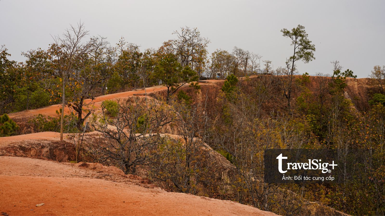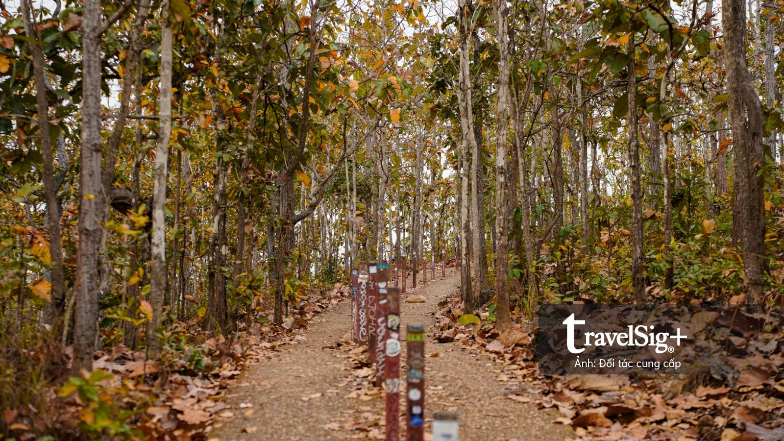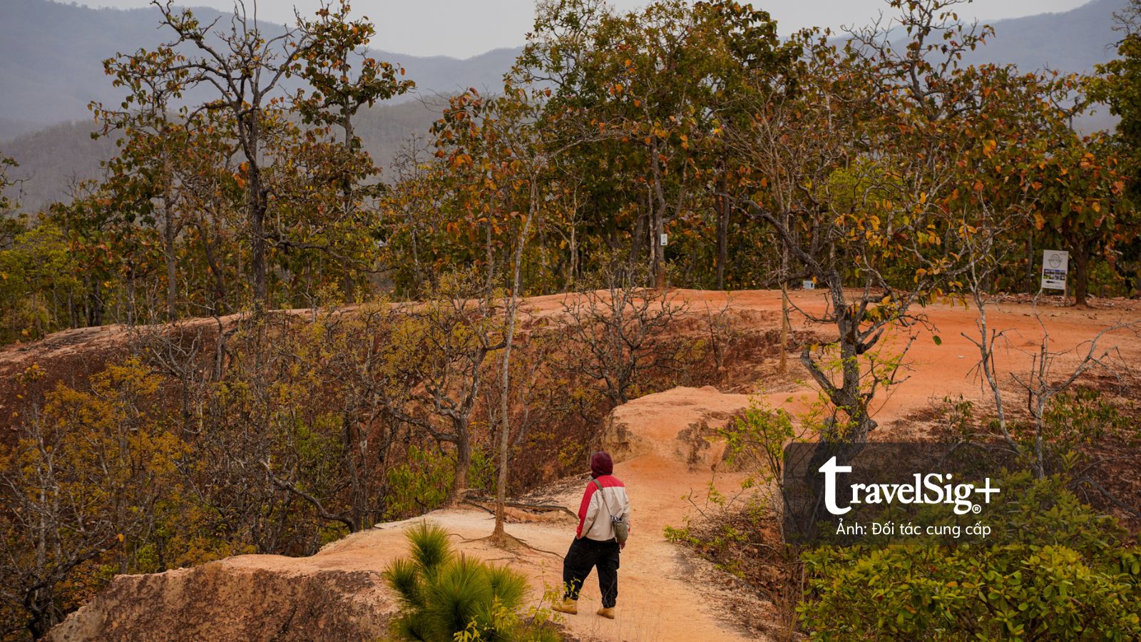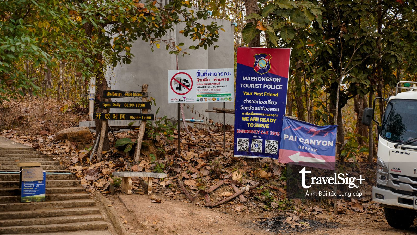 Đoạn đường dài chừng 300m xuyên qua cánh rừng lá đã chuyển màu nâu vàng của mùa khô, nền đất đỏ cam càng thêm sẫm màu dưới cơn mưa nhẹ. Chỉ có một lối duy nhất để lên xuống, được ngăn cách bằng những cây cột sắt màu đỏ dán đầy những sticker đủ màu sắc của du khách, như những cột mốc nhỏ ghi dấu sự hiện diện của mỗi người tại Pai Canyon.