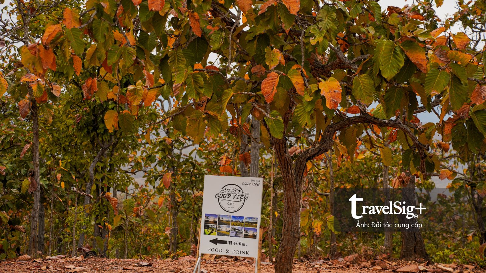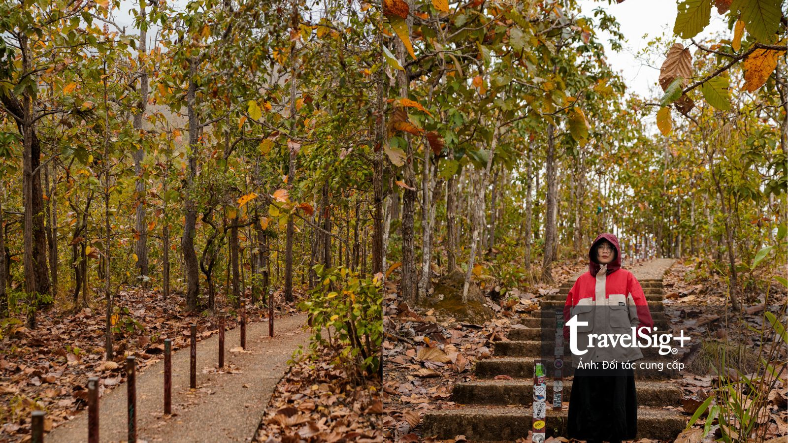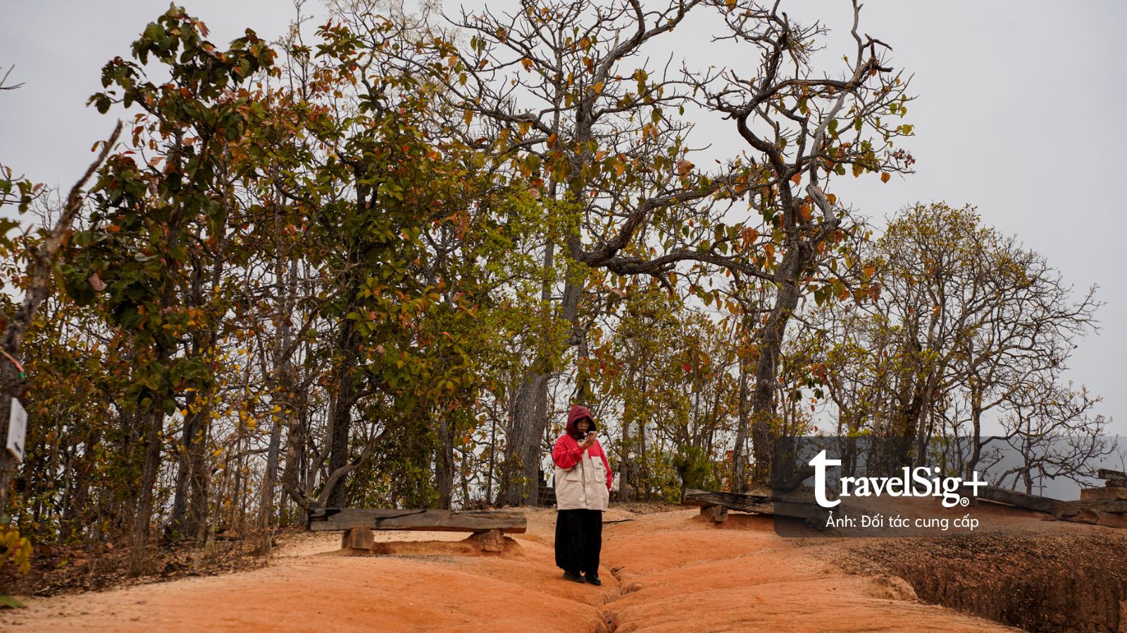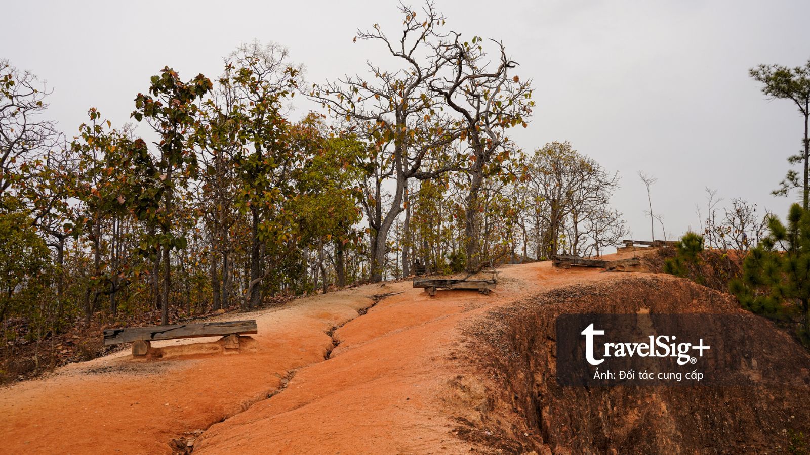 Đoạn đường dài chừng 300m xuyên qua cánh rừng lá đã chuyển màu nâu vàng của mùa khô, nền đất đỏ cam càng thêm sẫm màu dưới cơn mưa nhẹ. Chỉ có một lối duy nhất để lên xuống, được ngăn cách bằng những cây cột sắt màu đỏ dán đầy những sticker đủ màu sắc của du khách, như những cột mốc nhỏ ghi dấu sự hiện diện của mỗi người tại Pai Canyon.