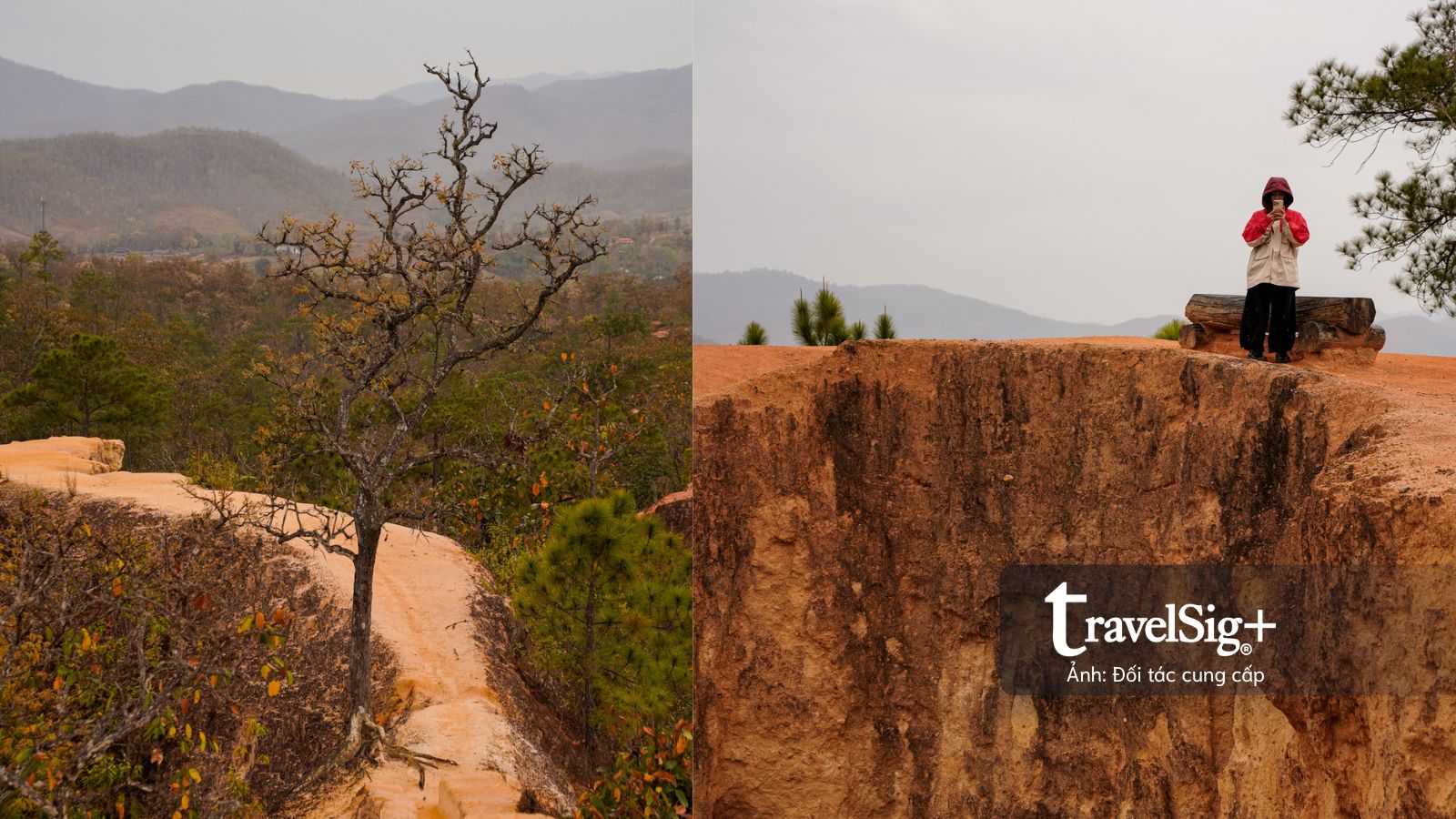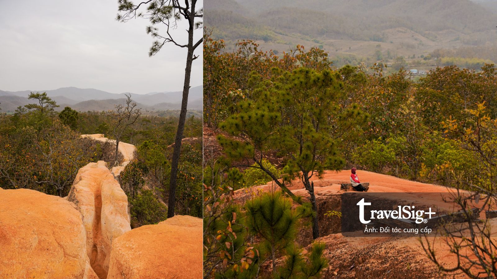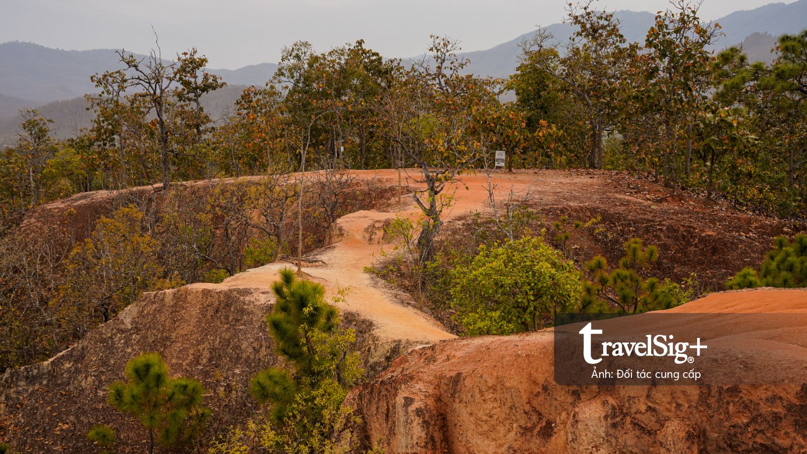 Địa hình nơi này là kết quả của quá trình xói mòn do gió và mưa qua hàng ngàn năm, tạo nên những rãnh sâu và những con đường mòn nhỏ hẹp uốn lượn trên đỉnh vách đá sa thạch với sắc độ đỏ cam lạ mắt. Từ độ cao khoảng 30m so với thung lũng bên dưới, chúng tôi có thể phóng tầm mắt bao quát toàn cảnh thung lũng Pai hùng vĩ.